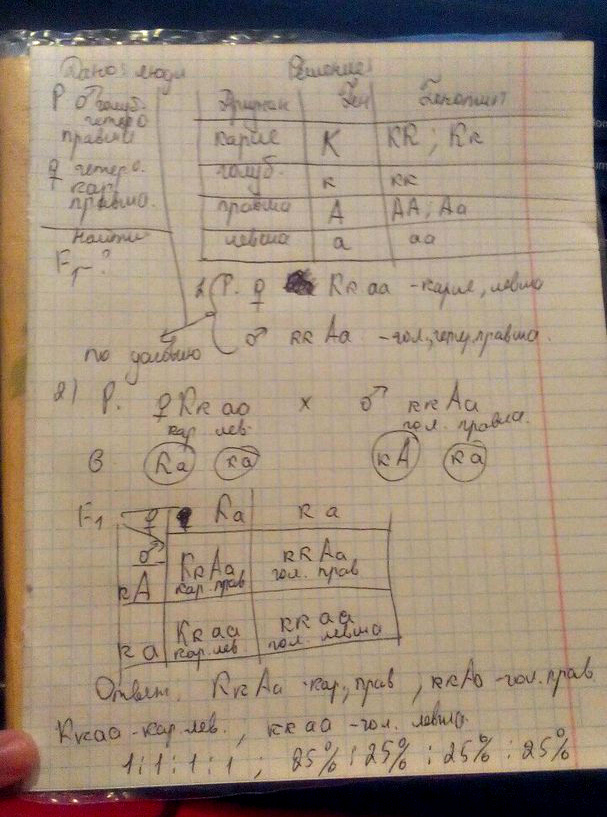 У человека карий цвет глаз(К) доминирует над голубым(к), а способность лучше владеть правой рукой доминирует над леворукостью. Голубоглазый гетерозиготный правша женился на гетерозиготной кареглазой левше. Каких детей можно ожидать?