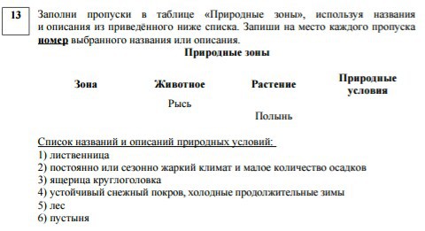 зона:лес,пустыня Животное: ящерица круглоголовка, рысь.Растение: полынь, лиственница. Природные условия: постоянно или сезонно жаркий климат и малое количество осадков, устойчивый снежный покров, холодные продолжительные зимы