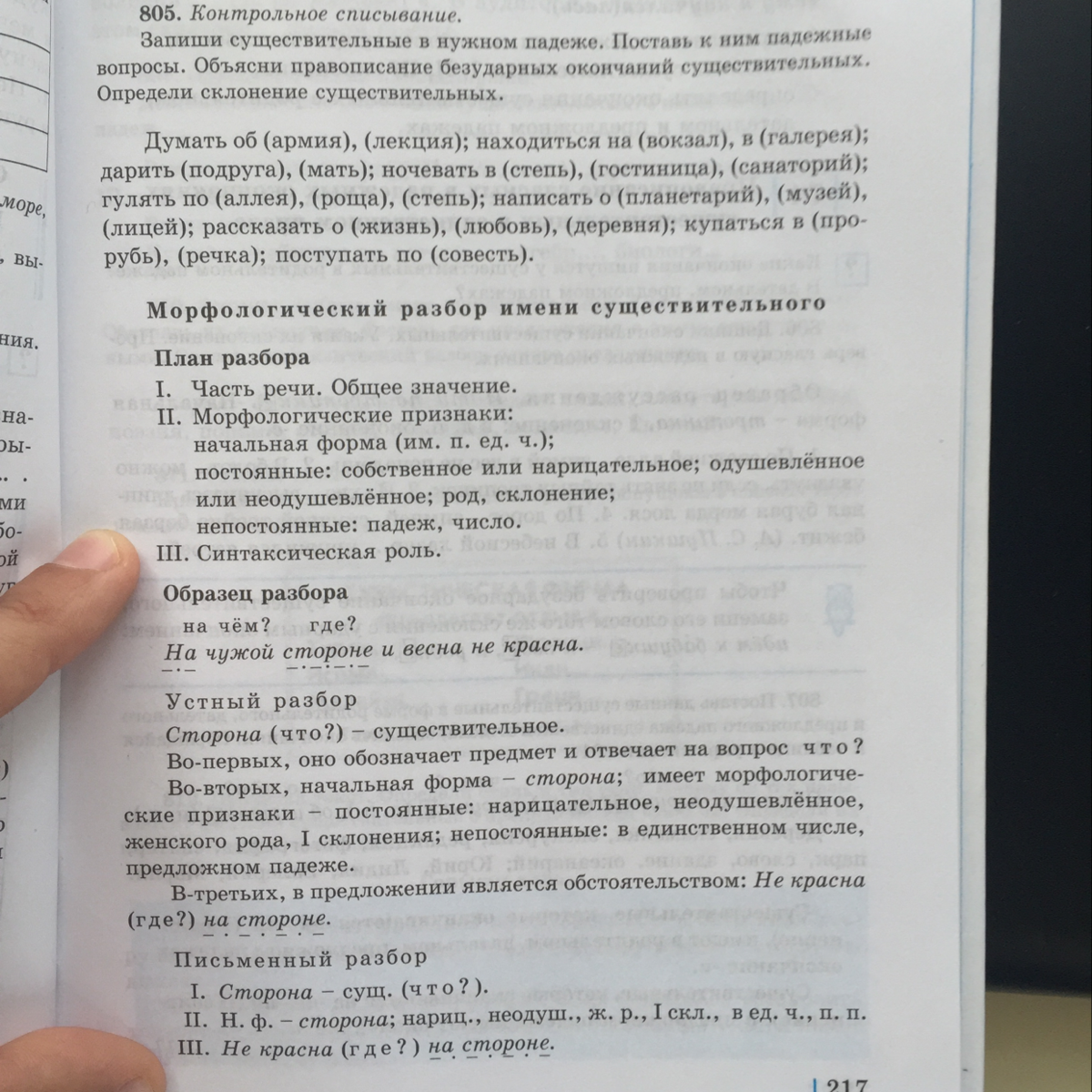 Думать (о чем?) об армии (П.п., 1 скл.), о лекции (П.п., 1 скл.); находиться (где?) на вокзале (П.п., 2 скл.), в галерее (П.п., 1 скл.); дарить (кому?) подруге (Д.п., 1 скл.), матери (Д.п., 3 скл.); ночевать (где?) в степи (П.п., 3 скл.), в гостинице (П.п., 1 скл.), в санатории (П.п., 2 скл.); гулять (по чему?) по аллее (Д.п., 1 скл.), по роще (Д.п., 1 скл.), по степи (Д.п., 3 скл.); написать (о чем?) о планетарии (П.п., 2 скл.), о музее (П.п., 2 скл.), о лицее (П.п., 2 скл.); рассказать (о чем?) о жизни (П.п., 3 скл.), о любви (П.п., 3 скл.), о деревне (П.п., 1 скл.); купаться (в чем?) в проруби (П.п., 3 скл.), в речке (П.п., 1 скл.); поступать (по чему?) по совести (Д.п., 3 скл.).