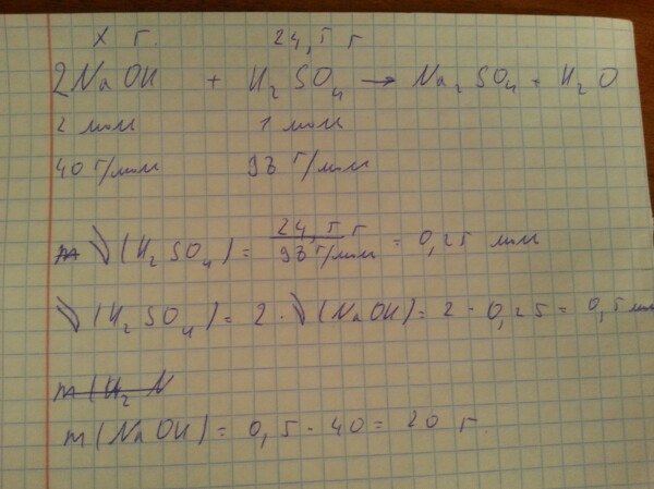Рассчитайте массу гидроксида натрия,необходимого для реакции с 24,5 г. серной кислоты.