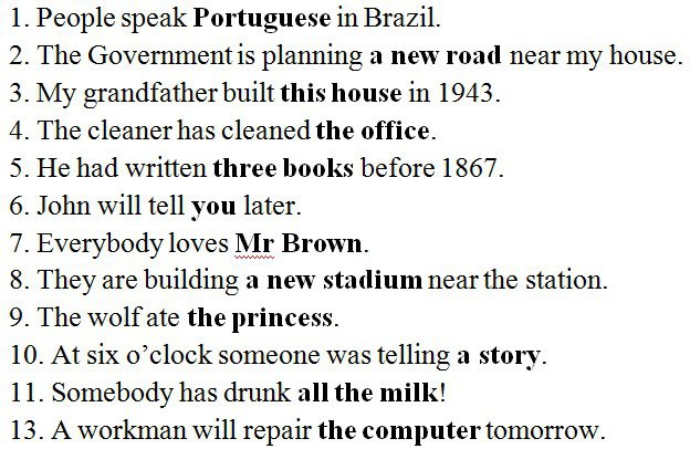 1. Portuguese is spoken in Brazil by people. 2. A new road is being planned near my house by the Government. 3. This house was built in 1943 by my grandfather. 4. The office has been cleaned by the cleaner. 5. Three books had been written before 1867 by him. 6. You will be told later by John. 7. Mr Brown is loved by everybody. 8. A new stadium is being built near the station by them. 9. The princess was eaten by the wolf. 10. A story was being told at 6 o'clock by someone. 11. All the milk has been drunk by somebody. 12. The computer will be repaired tommorow by a workman.