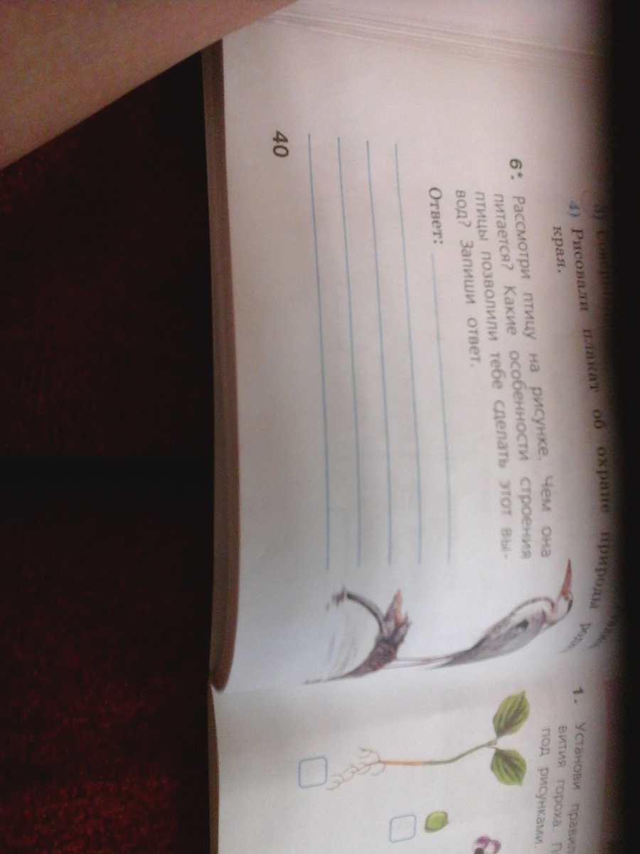 на рисунке изображена цапля.Её основная пища-водоплавающие.Особенности строения её длинного клюва,помогают ловить рыбу и лягушек и целиком их захватывать.