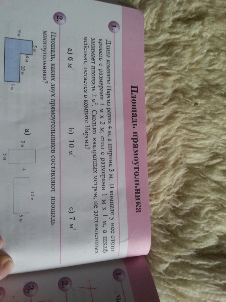 площадь комнаты 4*3=12(м2) Считаем сколько занимает иебель: 1*1+1*2+2=1+2+2=5(м2). 12-5=7(м2)