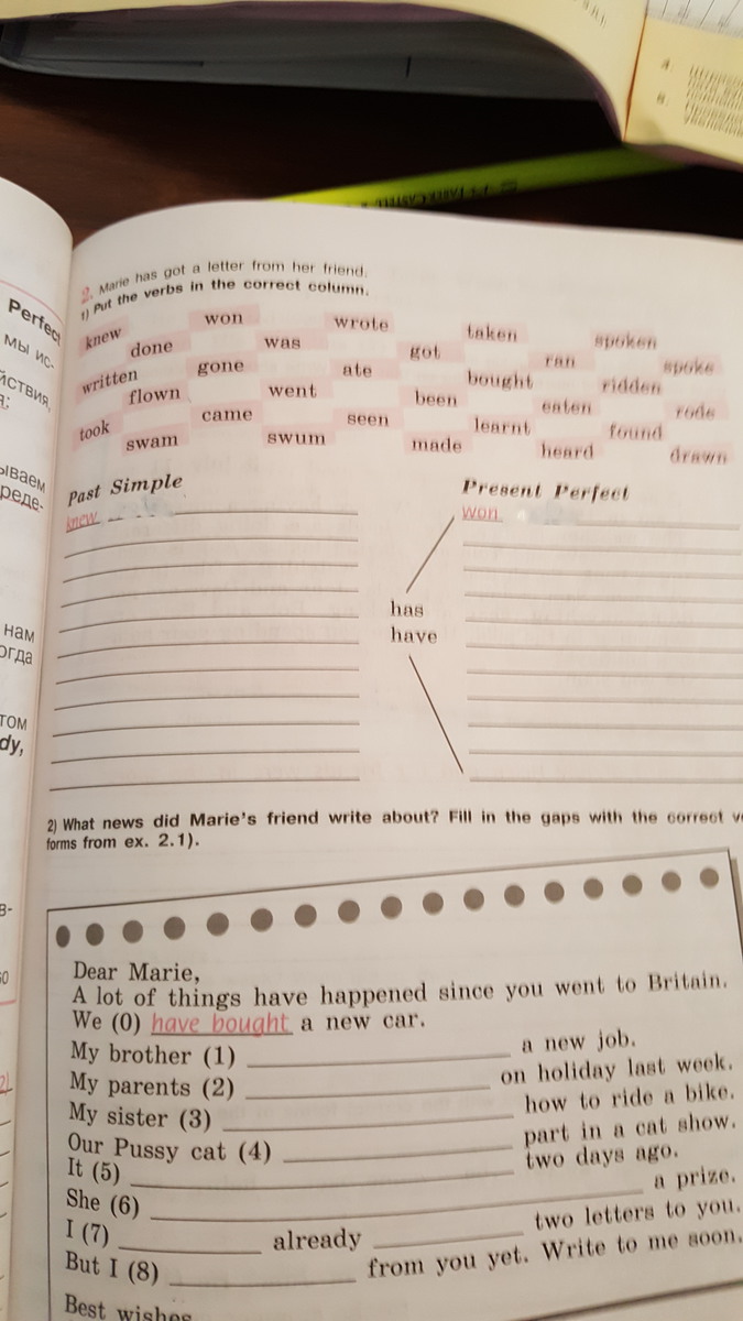 Past Simple: knew won wrote was got ran spoke ate bought went rode took came learnt found swam made heard