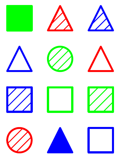 На столе выложено 12 карточек, на каждой из которых нарисована некоторая фигурка. Фигурка обладает тремя свойствами: формой, цветом и раскраской. Сетом называется комбинация из трех таких карточек, что по каждому свойству они или одинаковые, или полностью разные.