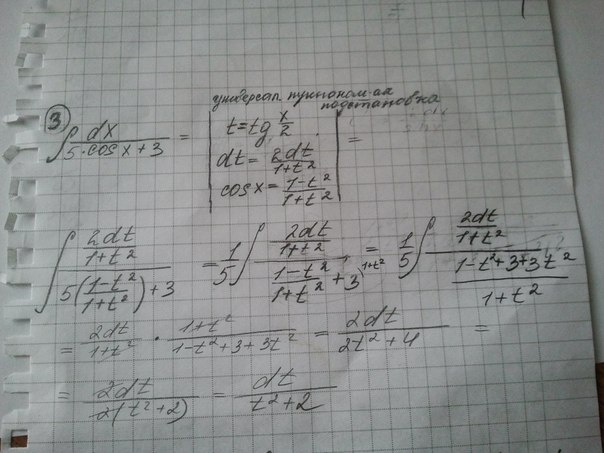 t = tg(x/2), dt = 1/2 sc^2(x/2) dx. sin(x) = (2t)/(t^2+1), cos(x) = (1-t^2)/(t^2+1) и dx = (2dt)/(t^2+1):