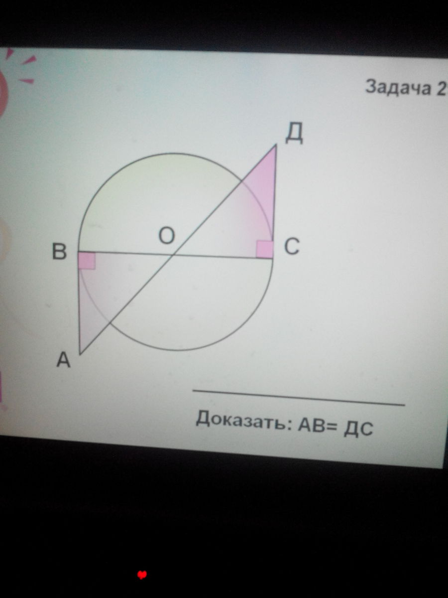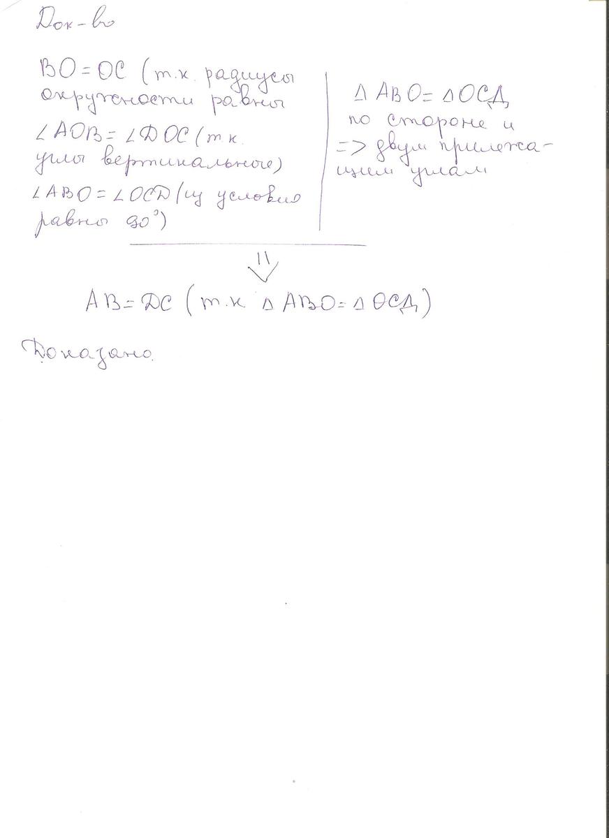 BO=OC тк это радиус, <BOA=<DOC тк они накрестлежащие, следовательно эти треугольники равны (по 2-м углам и стороне) , следовательно AB=DC