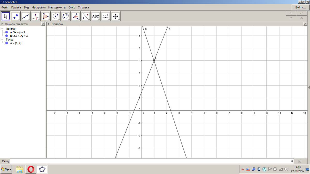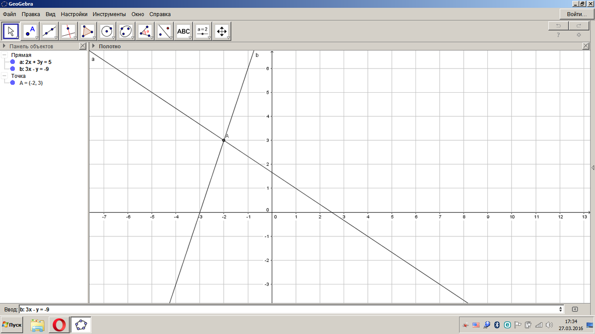 Построить графики линейных уравнений и определить координаты их точки пересечения: