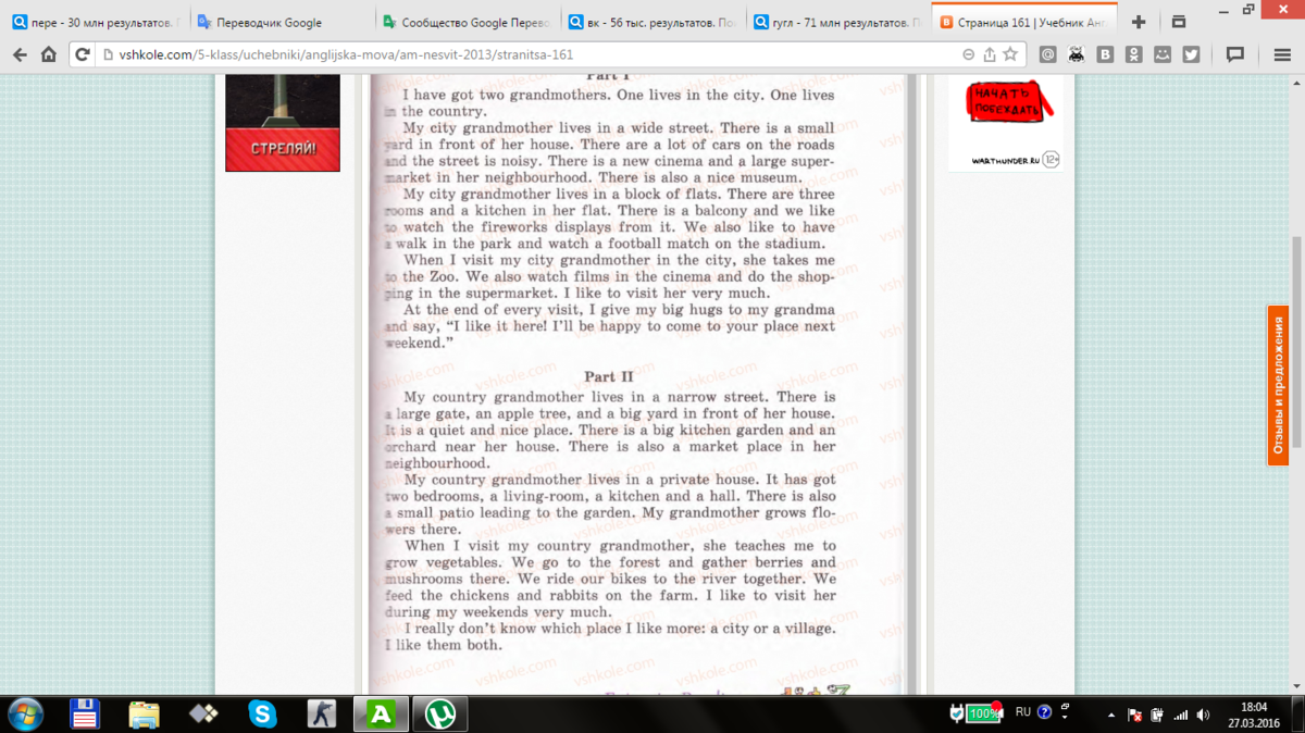 Когда я езжу к бабушке в город, она водит меня в зоопарк. Мы ходим на фильмы в кинотеатр и за покупками - в супермаркет. Мне очень нравится быть у нее. А когда нужно уезжать, то я крепко обнимаю ее и говорю : " Мне здесь нравится. Буду очень рад приехать снова на следующих выходных".