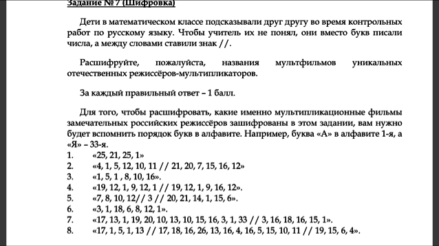 7) "17,13,1,19,20,10,13,10,15,16,3,1,33//3,16,18,16,15,1" - "Пластилиновая ворона"