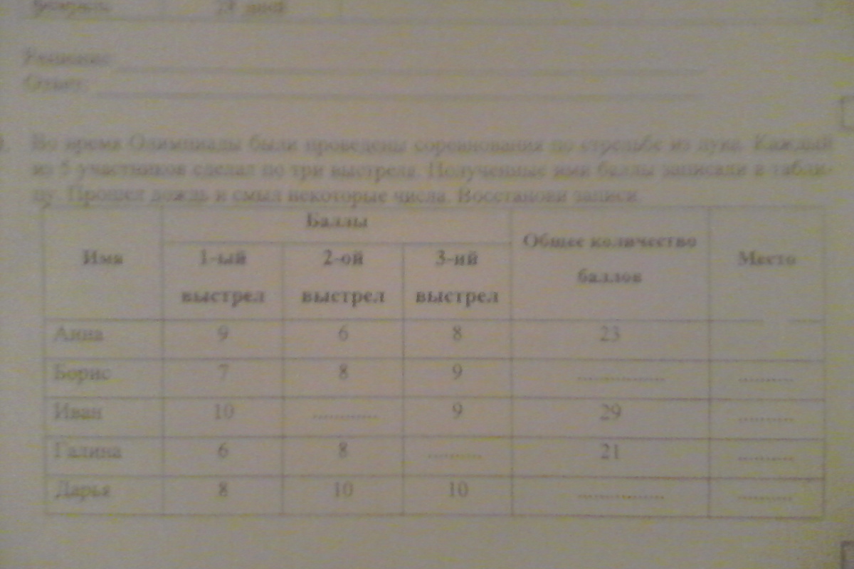Во время Олимпиады были проведены соревнования по стрельбе из лука.Каждый из 5 участников сделалтпо три выстрела . Полученные ими баллы записали в таблицу . Прошёл дождь и смысл некоторые числа. Востанови запись.