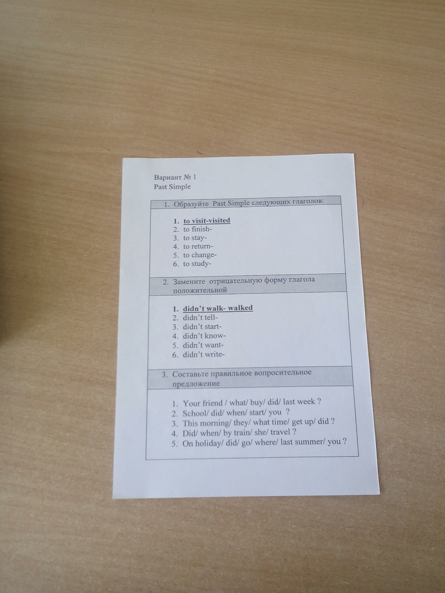 1. finished, stayed, returned, changed, stadied. 2. told, started, knew, wanted, wrote. 3. What did your friend buy last week? When did you start school? What time did they get up this morning? When did she travel by train? Where did you go on holiday last summer?