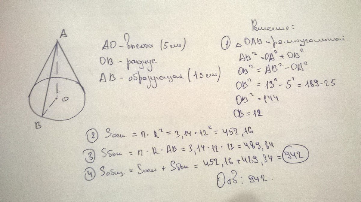 Образующая конуса 13 см, высота 5 см.Найдите площадь его поверхности.