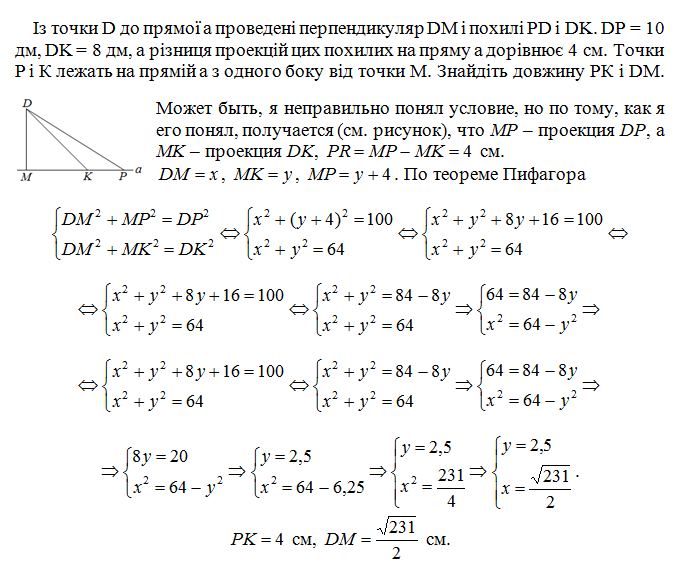 Із точки D до прямої а проведені перпендикуляр DM і похилі PD і DK. DP = 10 дм, DK = 8 дм, а різниця проекцій цих похилих на пряму а дорівнює 4 см. Точки Р і К лежать на прямій а з одного боку від точки М. Знайдіть довжину РК і DM.