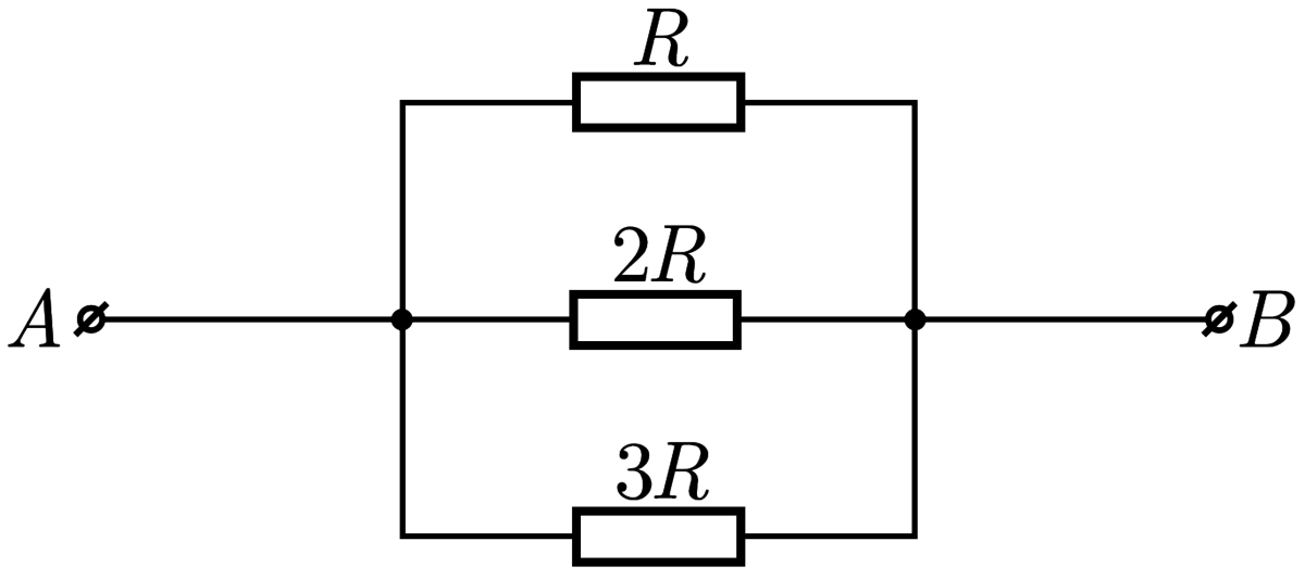 На рисунке представлена схема электрической цепи, состоящей из трёх параллельно соединённых резисторов. Между концами AA и BB поддерживается постоянное напряжение. Определите величину силу тока, протекающего через резистор сопротивлением 2R2R, если общая сила тока в цепи составляет 165 мА165 мА? Ответ выразите в мАмА, округлив до целых.