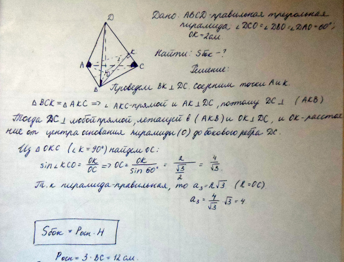 В правильной треугольной пирамиде боковые грани наклонены к плоскости основания под углом 60о. Расстояние от центра основания до боковой грани равно 2 см. Найдите площадь боковой поверхности пирамиды.