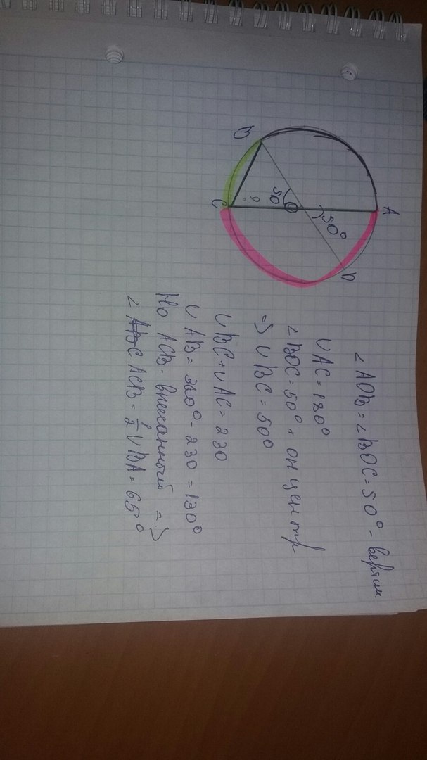 В окружности с центром О отрезки АС и ВД - диаметры. Угол АОД равен 50°. Найдите угол АСВ. Ответ дайте в градусах.
