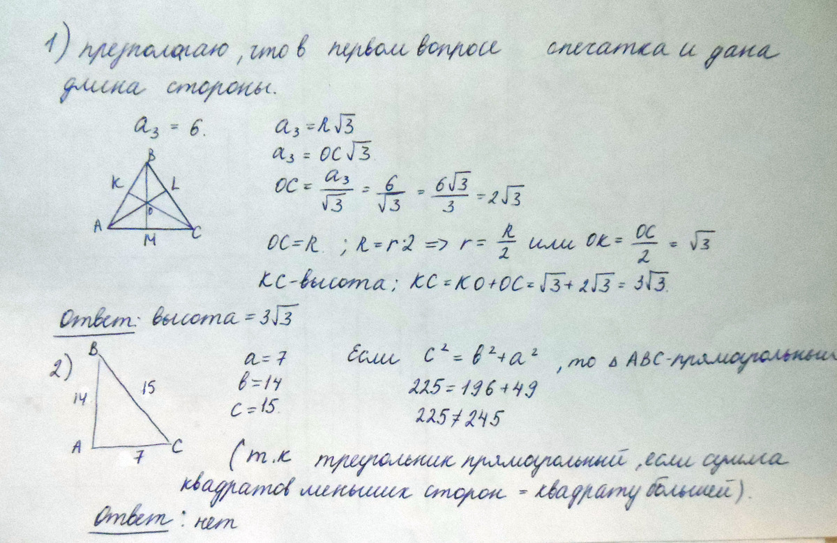 1.Найти высоту равностороннего треуголника,если его высота равна 6см.