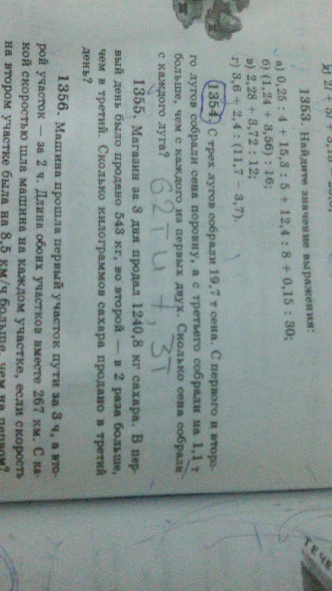 С трех дугов собрали 19,7 т. сена. С первого и второго дугов собрали сена поровну, а с третьего собрали на 1,1 т. больше, чем с каждого из первых двух. Сколько сена собрали с каждого дуга?