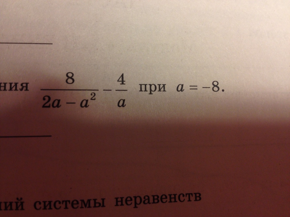 frac{8}{2a-a^2} - frac{4}{a} = frac{8}{2*(-8)-(-8)^2}- frac{4}{-8} = frac{8}{-16-64}+ frac{1}{2} =- frac{1}{10}+ frac{1}{2}= frac{2}{5}