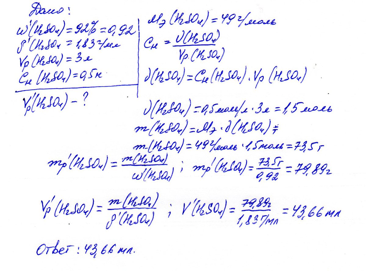Какой объем 92%-ной серной кислоты плотностью 1,83 г/мл следует взять для приготовления 3л 0,5н. раствора?