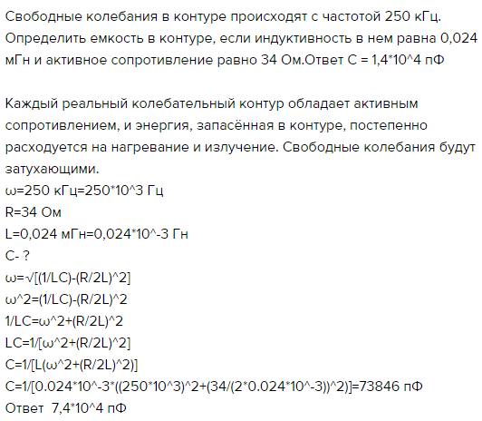 Собственная частота колебаний в контуре равна 250 кГц. Найди электроемкость конденсатора, если индуктивность равна 24 мкГН