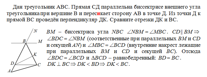 Дан треугольник АВС. Прямая СД параллельна биссектрисе внешнего угла треугольника при вершине В и пересикает сторону АВ в точке Д. Из точки Д к прямой ВС проведён перпендикуляр ДК. Сравните отрезки ДК и ВС.