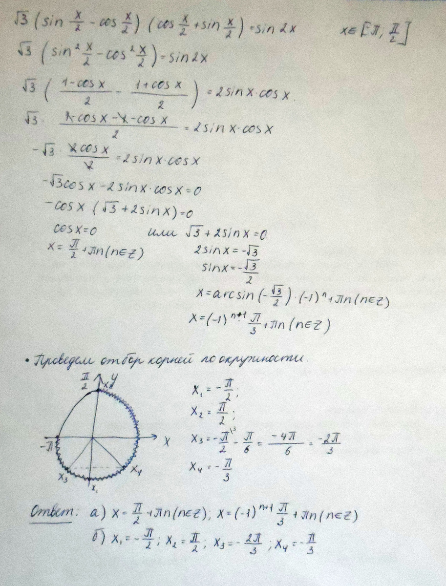 √3(sin x2-cos x2)*(cos x2+sin x2)=sin2x решить и отобрать корни на отрезке от -п до п2