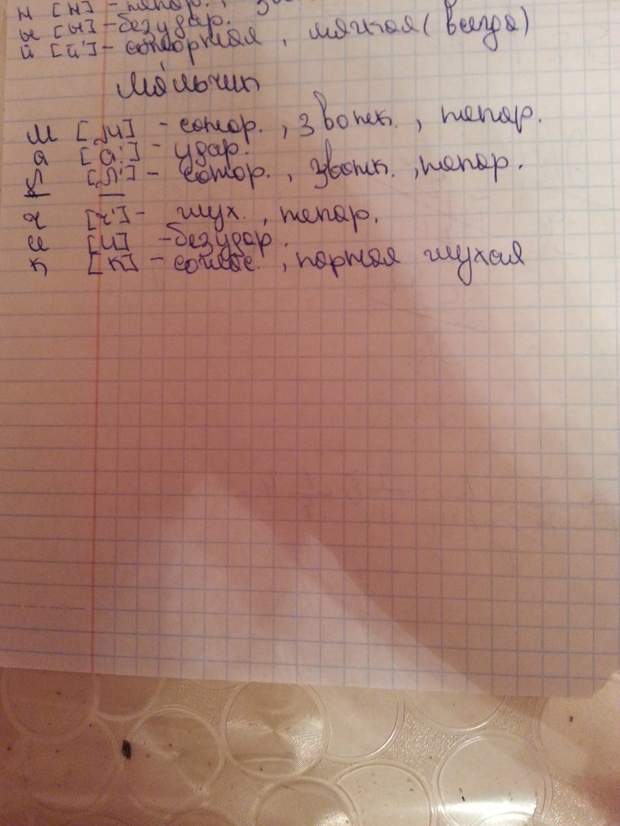 м→[м]:согласный, непарный звонкий, сонорный, парный твёрдыйа→[а]:гласныйл→[л']:согласный, непарный звонкий, сонорный, парный мягкийь→—ч→[ч']:согласный, непарный глухой, непарный мягкийи→[и]:гласныйк→[к]:согласный, парный глухой, парный твёрды