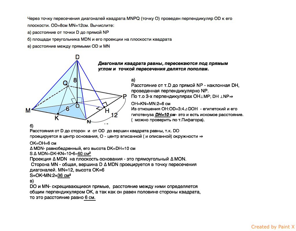 Через точку пересечения диагоналей квадрата MNPQ (точку О) проведен перпендикуляр OD к его плоскости. OD=8см MN=12см. Вычислите:
