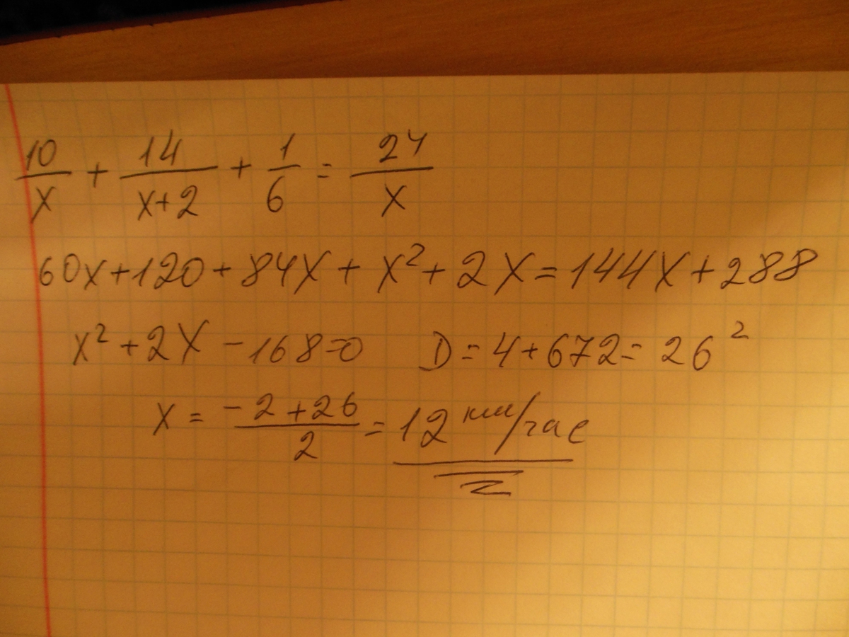 велосипедист должен был проехать от поселка до станции 24км. Проехав 10км, он сделал остановку на 10мин. увеличив после этого скорость на 2км/ч, он прибыл на станцию вовремя. найдите первоначальную скорость велосипедиста