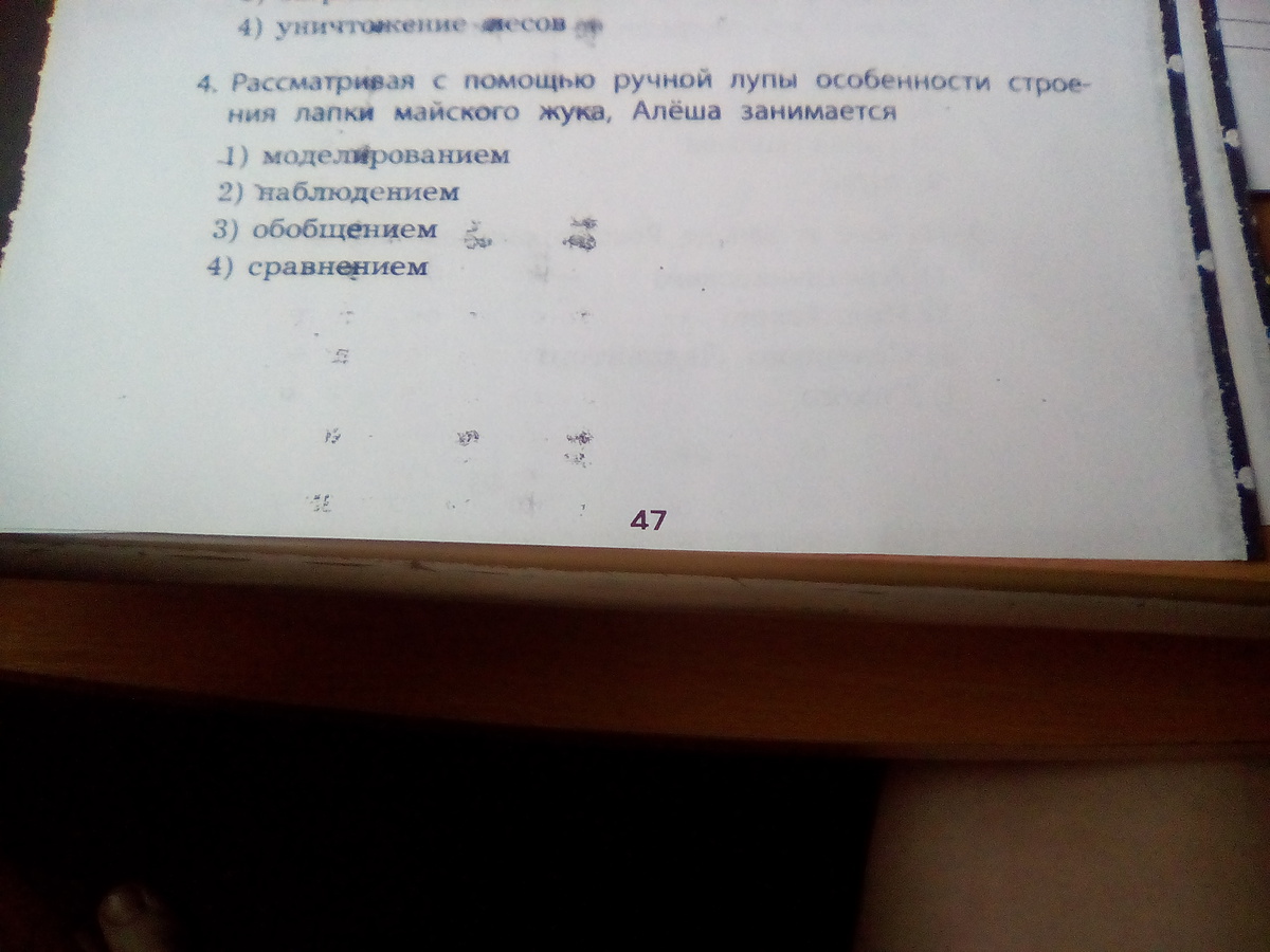 Рассматривая с помощью ручной лупы особенности строения лапки майского жука Алеша занимается наблюдением.