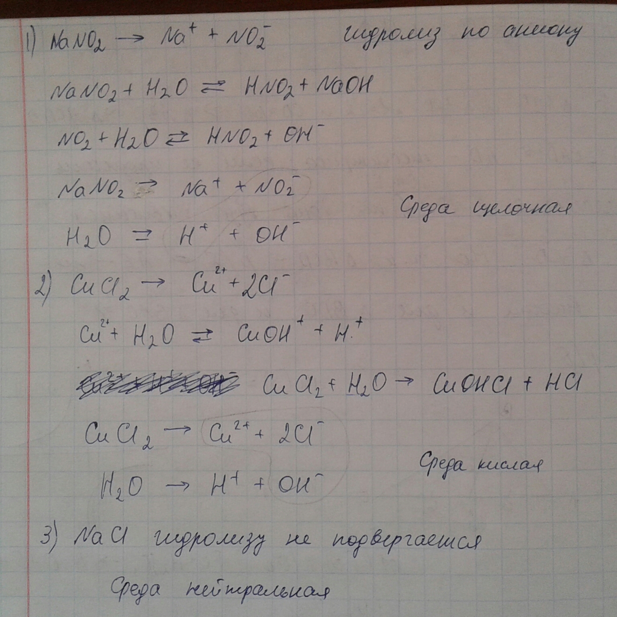 Составить уравнение реакций гидролиза солей в сокращённой ионной и молекулярной формах: NaNO2, CuCL2, NaCL. Указать реакцию среды