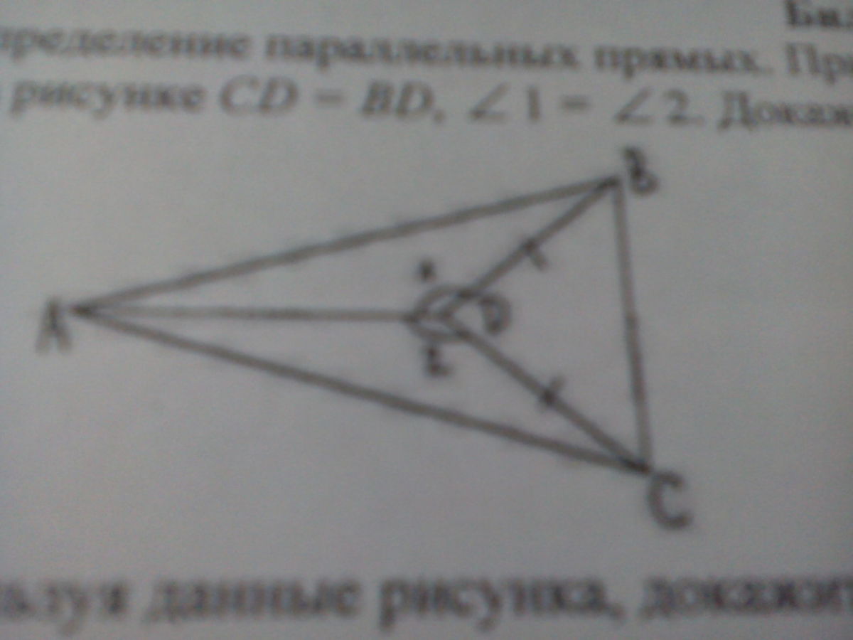На рисунке CD = BD, угол 1 = углу 2. Докажите что треугольник ABC равнобедренный
