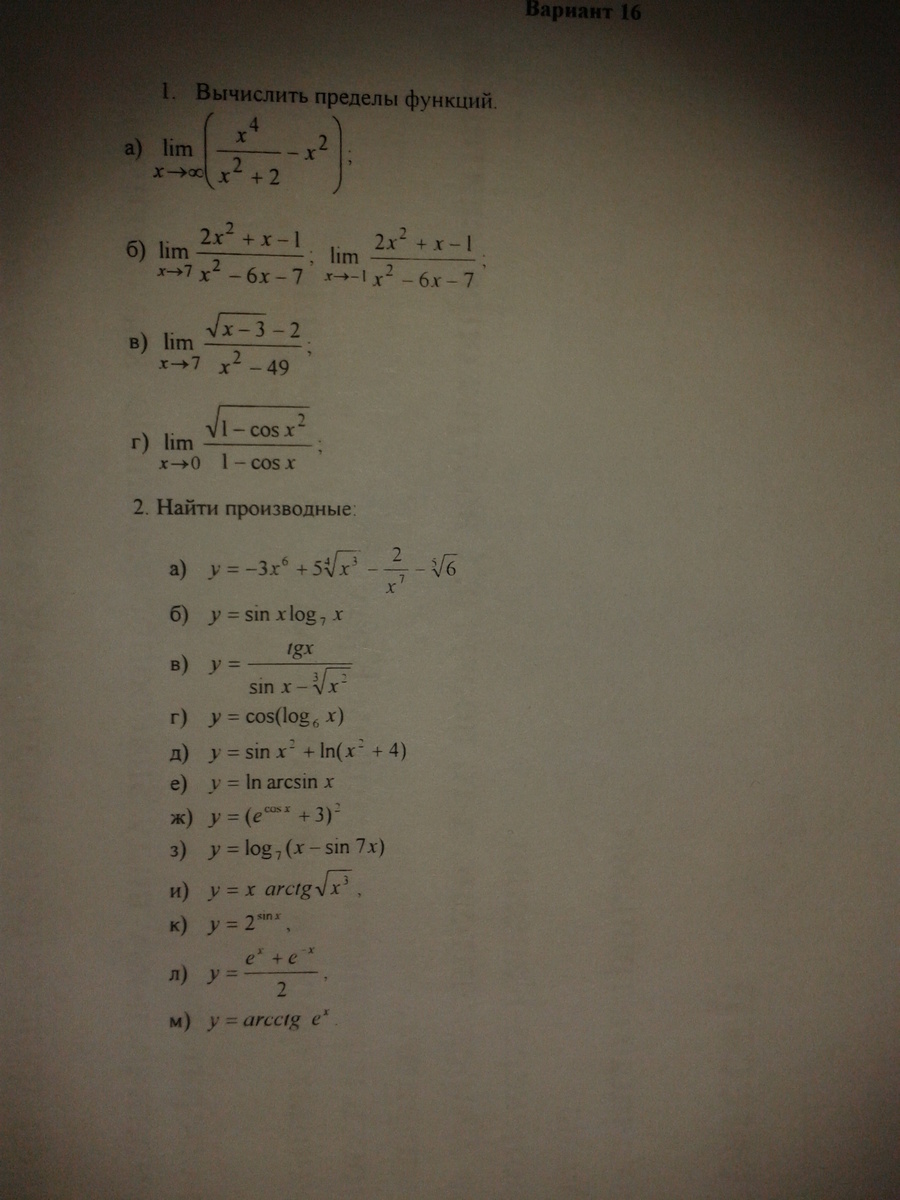 а) lim x->беск.(x^4 /( x^2+2) +x^2)=lim x->беск.((x^4 -x^2(x^2 +2))/(x^2+2))= lim x->беск. ((x^4 -x^4 -2x^2)/(x^2 +2)) = lim x->беск.(2x^2 /(x^2 +2))= lim x->беск.((2x^2 / x^2)/(x^2/x^2 + 2/x^2))= 2/(1+0)=2/1=2