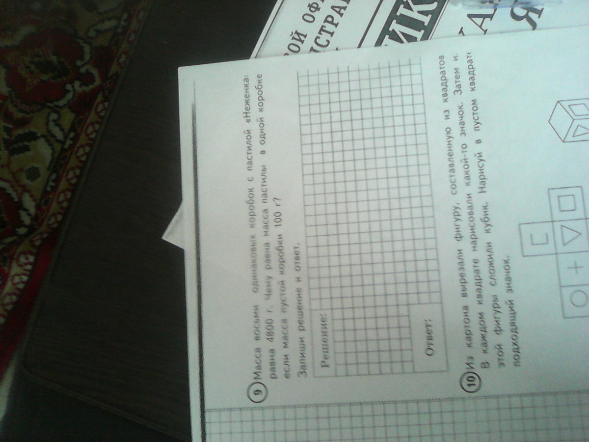 2. Из всей массы вычтем вес пустых коробок, и останется вес пастилы в 8 коробках: 4800-800=4000(г) - вес всей пастилы без коробок.