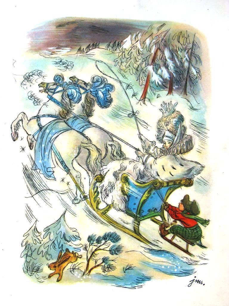 На первой иллюстрации мы видим сцену, где Кай едет на своих салазках за санями Снежной Королевы. Как мы помним из сказки, мальчик привязал свои саночки к саням, чтобы прокатиться, и уехал так далеко, что его пришлось идти выручать Герде.