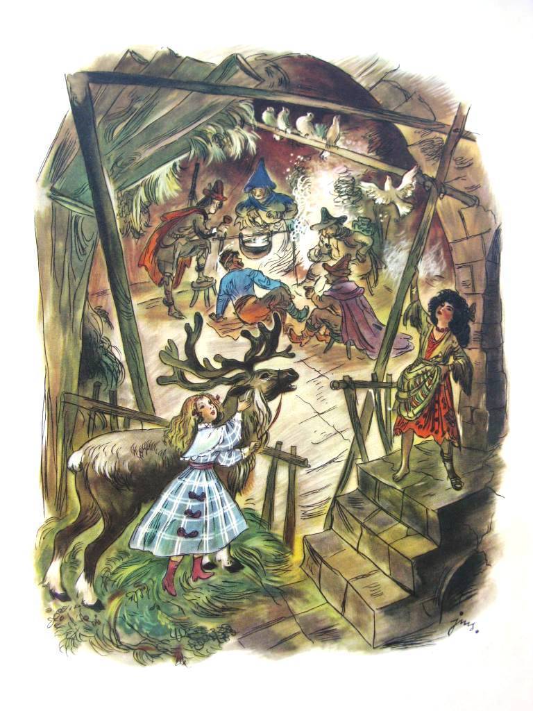 На второй иллюстрации мы видим Герду в тот момент, когда ее привели в логово разбойников и она знакомится со своей ровесницей Маленькой Разбойницей. Герда ласково гладит своего оленя. Наверняка олень устал и замерз. На заднем плане разбойники готовят еду в большом котле, подвешенном над костром, и разговаривают.