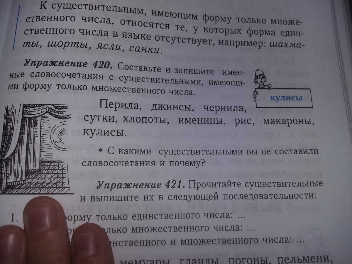 новые перила; рваные джинсы; синие чернила;старые хлопоты;белый рис;вкусные макароны; цветные кулисы