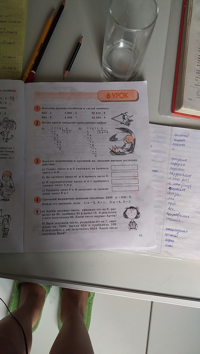 2.1785:5=357. 7407:3=2469. 3.(a+b)*(c-d),m:n-k,a*c+x:y,(b-m):(k*t). 4.a=o,b=1.6309*0+936:1=936. a=6,b=2.6309*6+939:2=38322. 5.50+18=68,68-65=3,3*40=120,120:6=20.Артем задумал число 20. 8454-108=8346,8346+654=9000,9000:1000=9,9*7=63.Валя задумала чисто 63