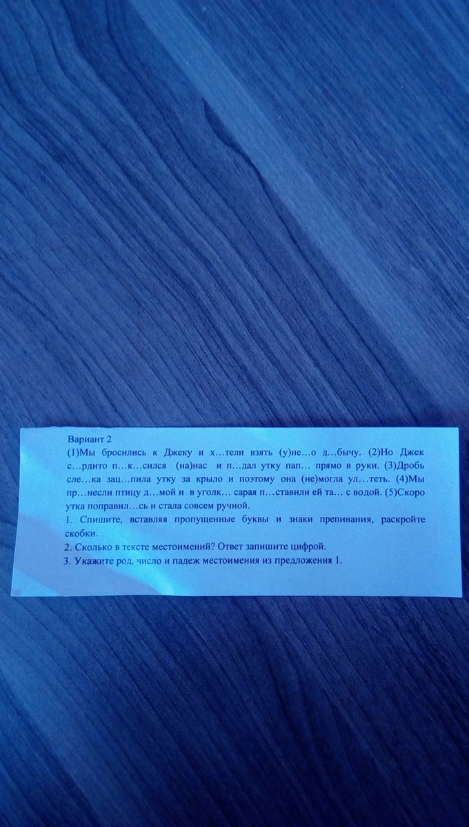 МЫ бросились к Джеку и хотели взять у НЕГО добычу.Но Джек сердито покосился на НАС и подал утку папе прямо в руки.Дробь слегка зацепила утку за крыло и поэтому ОНА не могла улететь.МЫ принесли птицу домой и в уголке сарая поставили ЕЙ таз с водой.Скоро утка поправилась и стала совсем ручной