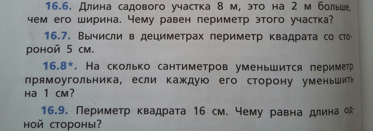 1) 8-2=6(м)-ширина 2)(8+6)*2=28(м)- периметр 2) 5*4=20 (кв.см)=2(кв.дм) 3 )16:4=4(см)-сторона квадр. 4) на 4 см уменьшится