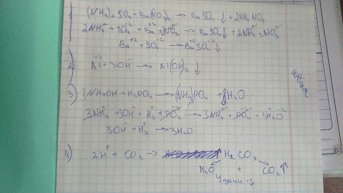 помогите пожалуйста!!!Написать уравнения реакций в молекулярной и ионной форме:1)(NH4)2SO4+Ba(NO3)2 2)Al+3OH=Al(OH)3 3)NH4OH+H3PO4= 4)2H+CO3=H2O+CO2