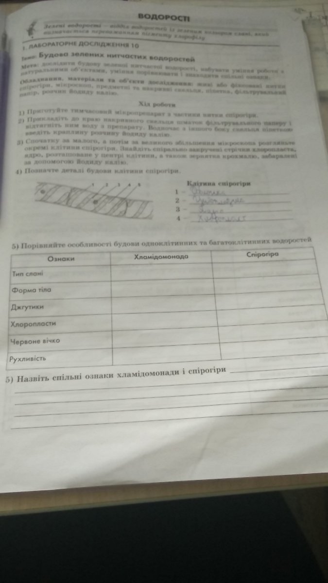 Признаки :тип слоевища, форма тела, джгутики, хлоропласты, красный глазок, подвижность. Растения: хламидомонада и спирогира.