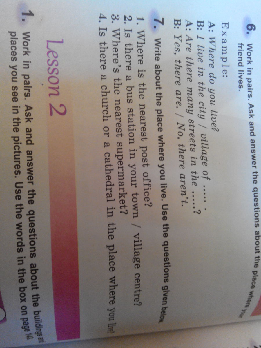 ты живешь. Используйте вопросы, данные записи о месте, где бель 1. Где ближайшая почта? Центр деревни 2. Есть автобусная станция в вашем городе Где ближайший супермаркет? место, где есть церковь или собор