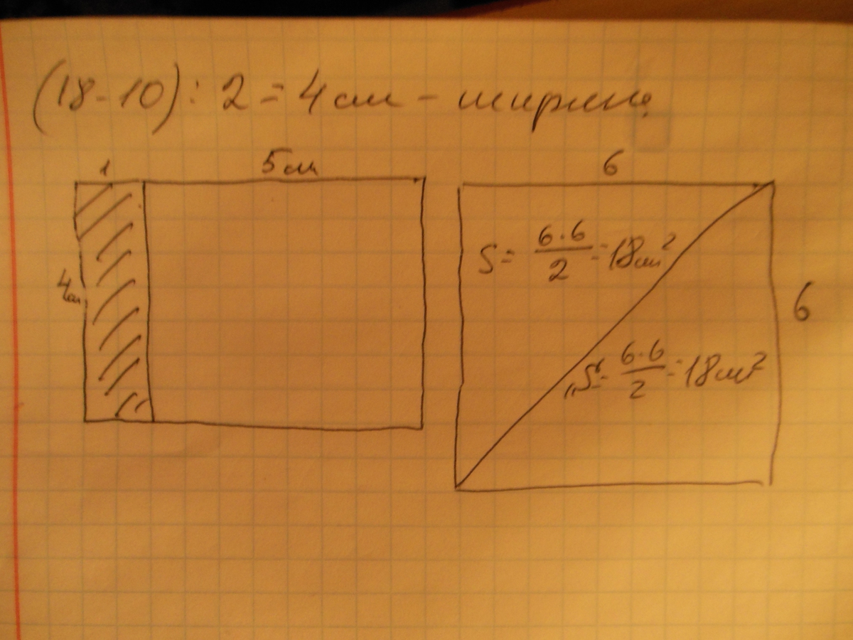 последнее: Начертите прямоугольник, если его периметр составляет 18 см, а длинна- 5 см.Заштрихуй 15 часть его. Рядом построй квадрат с длинной стороны 6 см.Проведи одну из его диагоналей и вычисли площадь каждого треугольника.