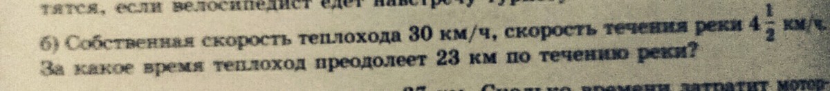 Надо расстояние(23) разделить на сумму течения реки и скорость катера(так как он плывёт по течению). Получается 23/30+4.5=0.7 часа