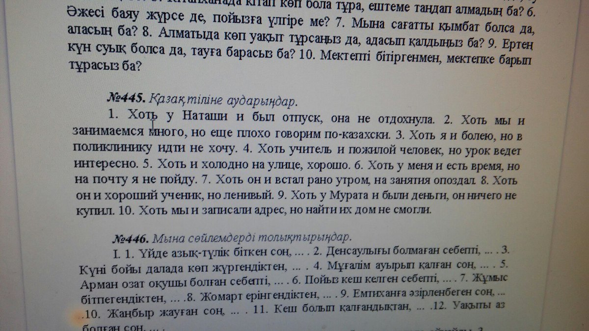 Наташада демалыс болганымен , ол демалмады. 2. Биз коп дайындалсакта казакша нашар сойлеймиз. 3. Мен ауырсамда , емханага баргым келмейди. 4. Мугалим улкен киси болса да, сабакты кызыкты отеди