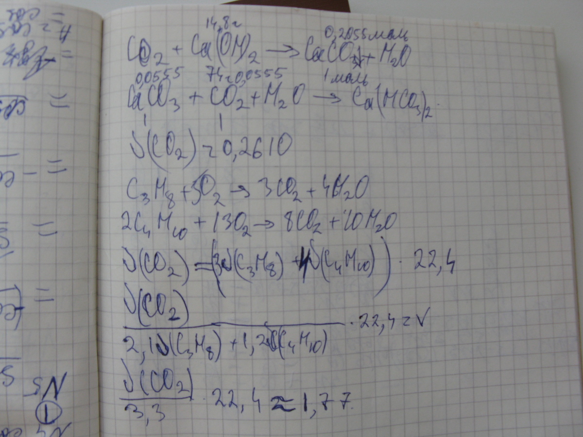 Углекислый газ, выделившийся при сжигании смеси пропана и бутана, с объемной долей пропана 70 %, полностью поглотили, пропустив через раствор, содержащий 14,8 г Ca(OH)2. Выпавший вначале осадок затем частично растворился, и в конце его масса составила 15,0 г. Чему равен объем (н.у.) исходной газовой смеси?ответ .1,7л. Помогите , очень нужно) Заранее спасибо)