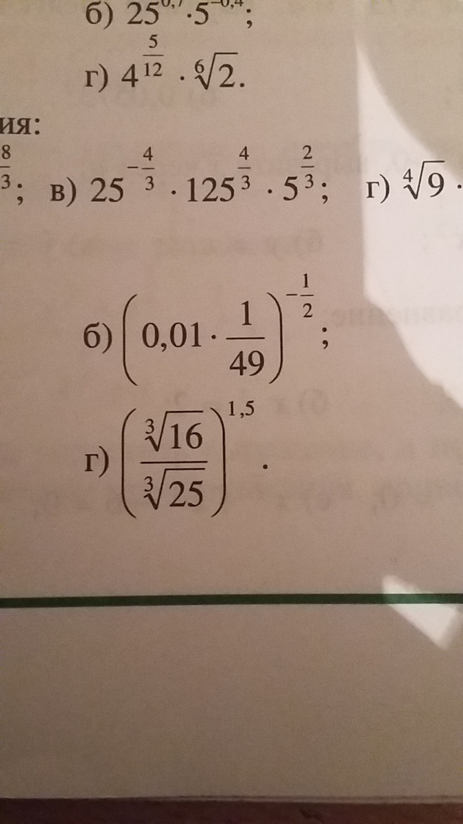 г) (16^1/3 / 25^1/3)^3/2= 16^1/3*3/2 / 25^1/3*3*2= 16^1/2 / 25^1/2=4/5=0.8